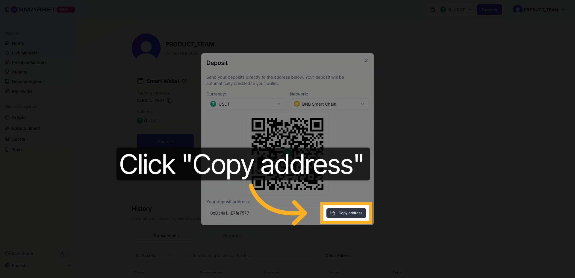 - To prevent fund loss, transfer crypto assets only over the respective network supported by Xmarket. When selecting the withdrawal network on the platform/wallet you are sending your funds from, make sure it matches the deposit network you have chosen on the Xmarket platform.