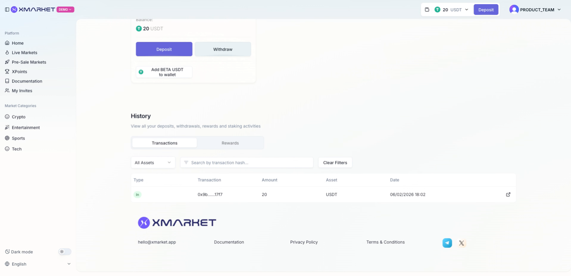 Xmarket은 USDT를 주요 거래 토큰으로 사용합니다.