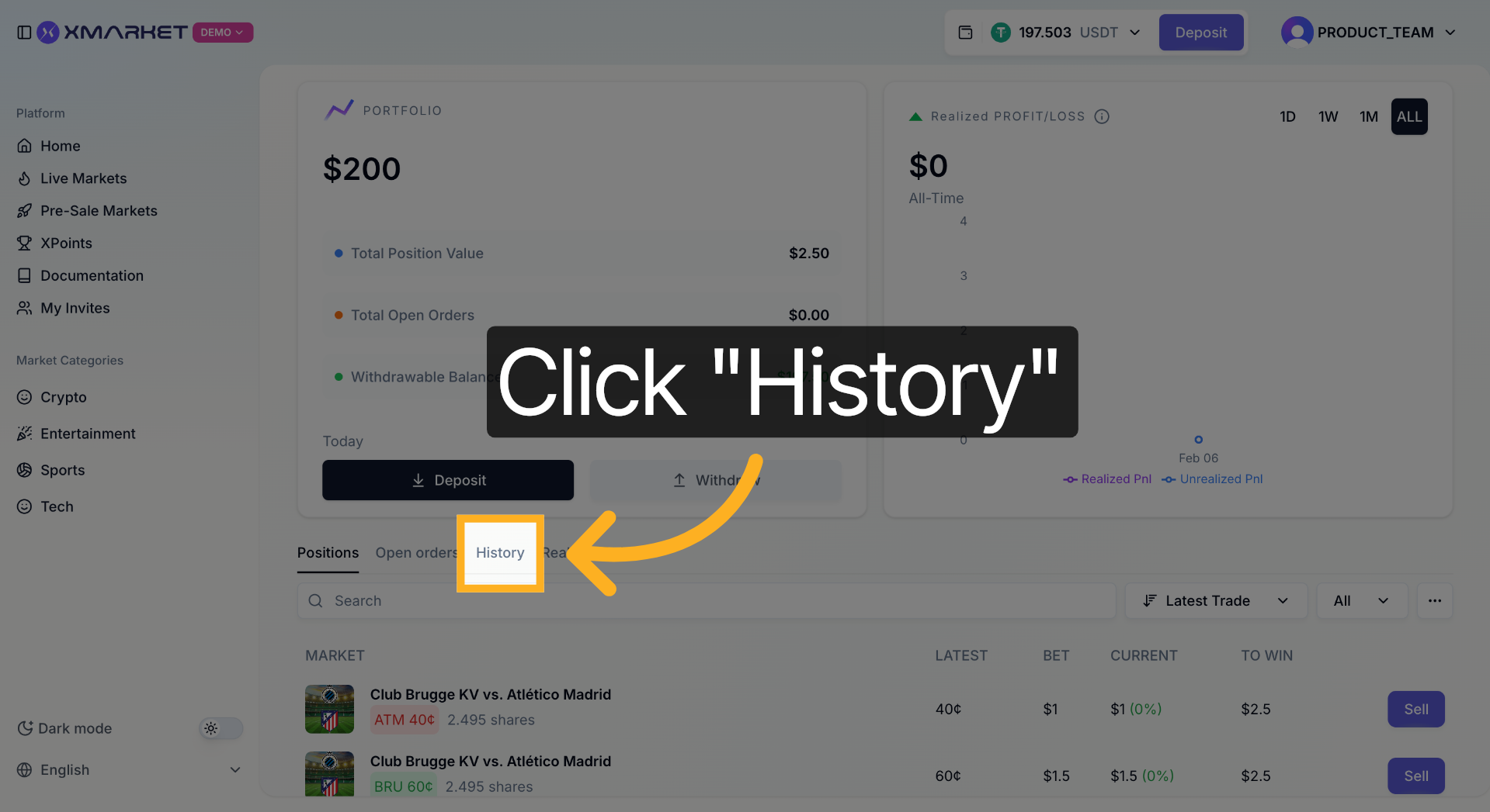 Xmarket 계정에 로그인한 후, My Positions를 클릭합니다.