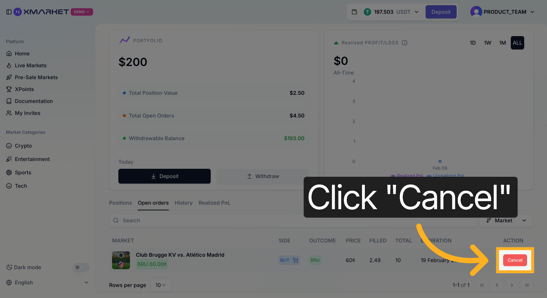 여러 마켓에 주문이 있는 경우 Portfolio 페이지에서도 취소할 수 있습니다.