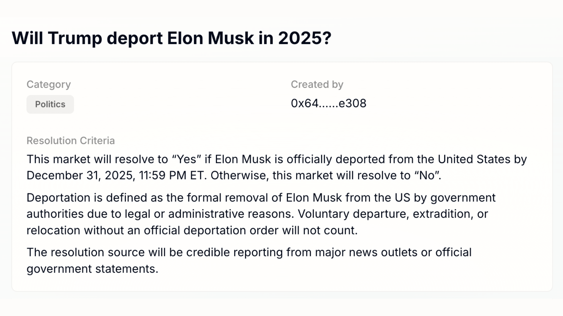 In some cases, markets may refer to a general standard like "major news outlets" as the basis for resolution, as seen in markets such as Will Trump deport Elon Musk in 2025? While this still requires independent corroboration, it narrows the range of acceptable sources to reputable, mainstream reporting.